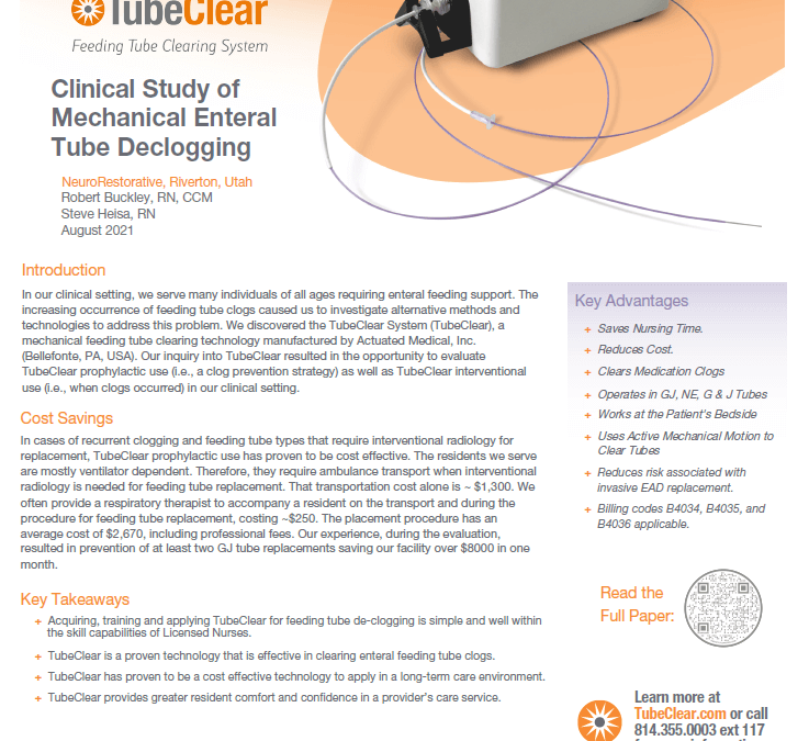 Robert Buckley, RN, CCM & Steve Heisa, RN NeuroRestorative, Riverton, Utah, August 2021 Key Takeaways Acquiring, training and applying TubeClear for feeding tube de-clogging is simple and well withinthe skill capabilities of Licensed Nurses. TubeClear is a proven...